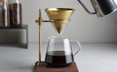 落ち着いた雰囲気のコーヒードリッパー。ブラスト加工が効いた真鍮スタンドとゴールドに輝くフィルターが重厚感のある佇まい。