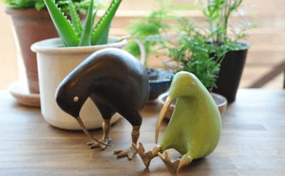 ニュージーランドの飛べない鳥キウイ。木彫りの置物になりました。話し声が聞こえてきそうな佇まいです。